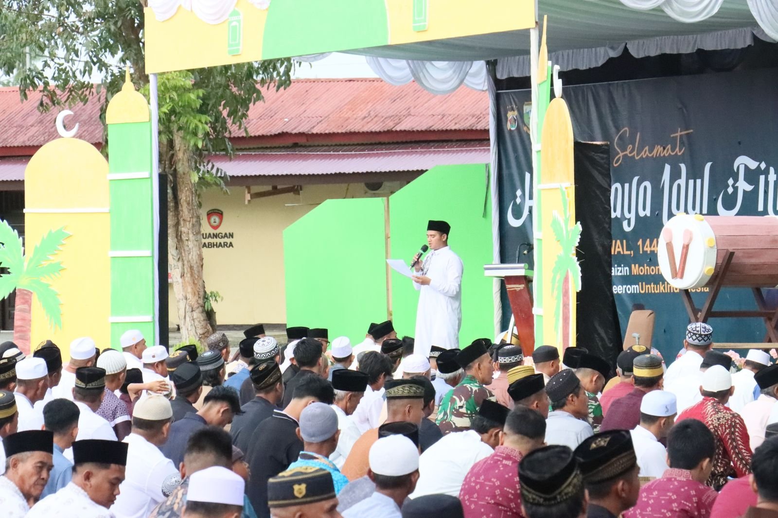 Pelaksanaan Sholat Idul Fitri dipimpin oleh Ust. Muhammad Assad, M.Sc., yang bertindak sebagai imam sekaligus khotib. Dalam khutbahnya, ia mengajak seluruh jamaah untuk senantiasa meningkatkan keimanan dan ketakwaan kepada Allah SWT, serta mempererat tali persaudaraan dan kebersamaan di tengah kehidupan bermasyarakat.