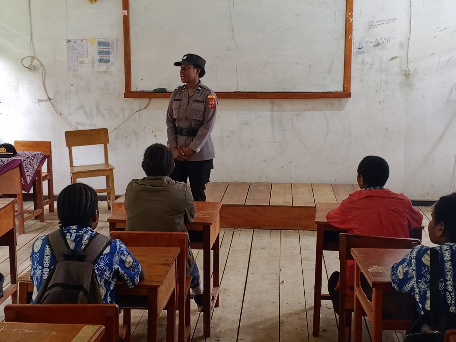 Papua — Personel kepolisian melaksanakan kegiatan pembinaan dan penyuluhan kepada para pelajar di SMP Negeri 4 Kampung Yogobak, Distrik Nogi, Kabupaten Lanny Jaya, Papua Pegunungan. Kegiatan tersebut merupakan bagian dari program pembinaan masyarakat dalam rangka Operasi Rasaka Cartenz 2026.