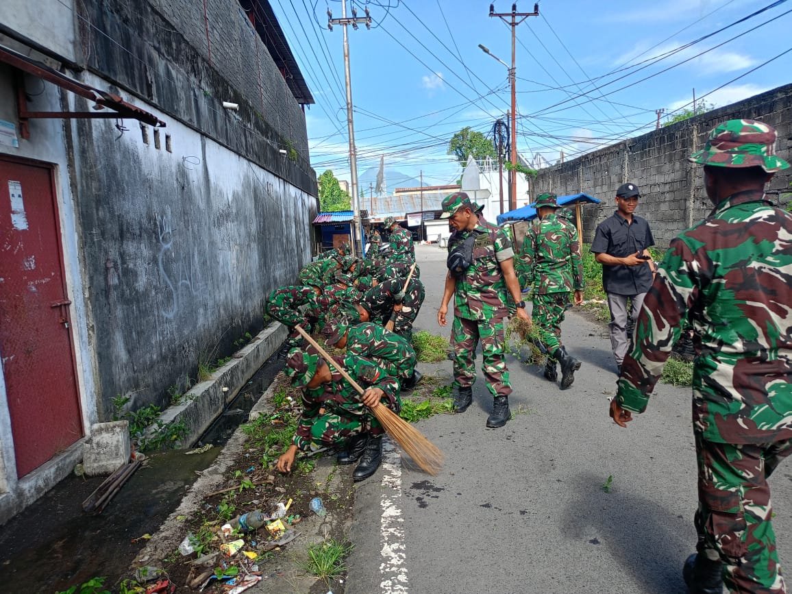 Bitung – Dalam rangka mendukung Gerakan Indonesia Asri, Personel Kodim 1310/Bitung dan Yonif TP 916/Bara Sakti Kodam XIII/Merdeka bersama masyarakat, melaksanakan kegiatan Karya Bakti pembersihan lingkungan bertempat di Kompleks Kanopi, Kelurahan Bitung Timur, Kecamatan Maesa, Kota Bitung, Rabu (18/03/2026).
