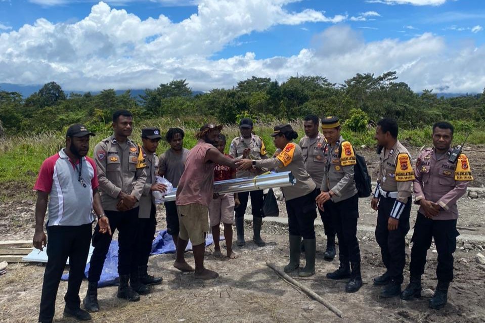 Dalam kegiatan tersebut, Kasat Binmas Wilhelma Kurut bersama Kasat Narkoba Alfius Erwin Simbiak serta para Bhabinkamtibmas menyerahkan bantuan berupa seng dan paku kepada masyarakat untuk mendukung pembangunan Gereja Katolik Kobakma, Senin (23/3/2026).